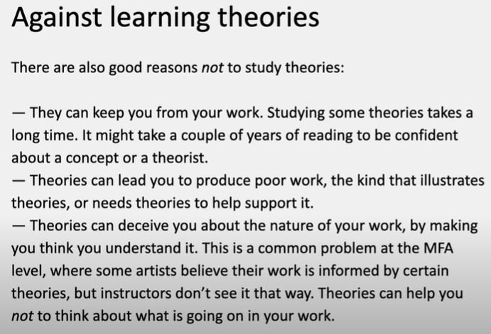 In the course of his series he takes time during video C28 to consider whether or not it is helpful, or desirable, for artists to study these theories at all. In the course of encapsulating his thoughts he presents two slides which summarize why it might be that students should avoid learning theory (or history). The slides below were taken from his video.